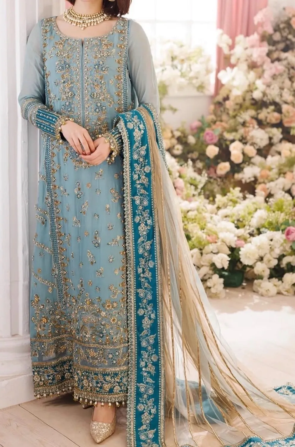 Elegant floral long gown with soft flowing silhouette and refined finishing. Perfect for daytime events and engagement ceremonies.